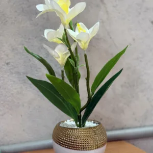 Add a touch of calm elegance to your decor with this Elegant Artificial Cream Yellow Orchid Lily Flower Plant. Featuring soft yellow-tinted blooms with natural green leaves, this beautiful faux plant is arranged in a white ceramic round pot accented with a textured golden rim. The addition of decorative white pebbles completes the realistic look. This maintenance-free floral arrangement is perfect for home interiors, office desks, hotel lobbies, or as a sophisticated gift for any occasion.