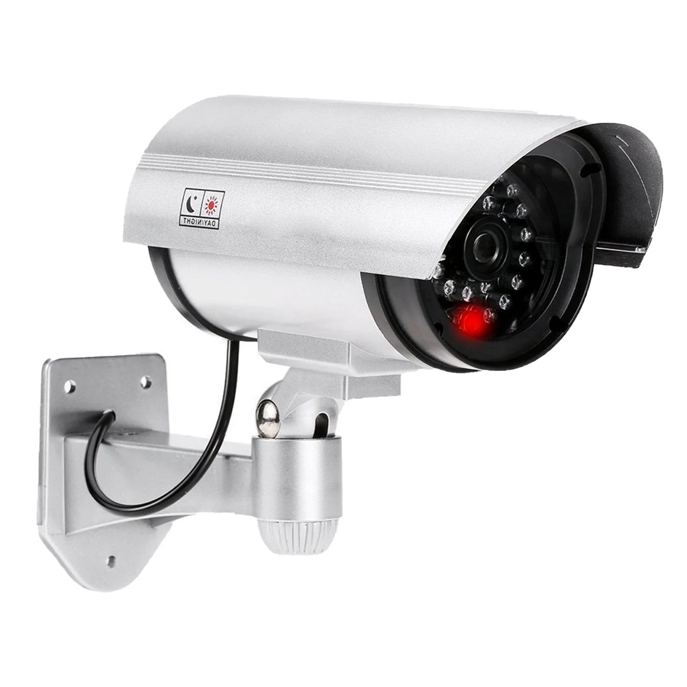 This type of fake realistic security camera resembles a lot to the real security camera with its high simulation features, a silver appearance comes with a LED red flashing light, a video line that looks like for real and thus making it to work as an authentic security camera in daily life. The flashing light LED makes this camera looks likea an operating actual security camera.